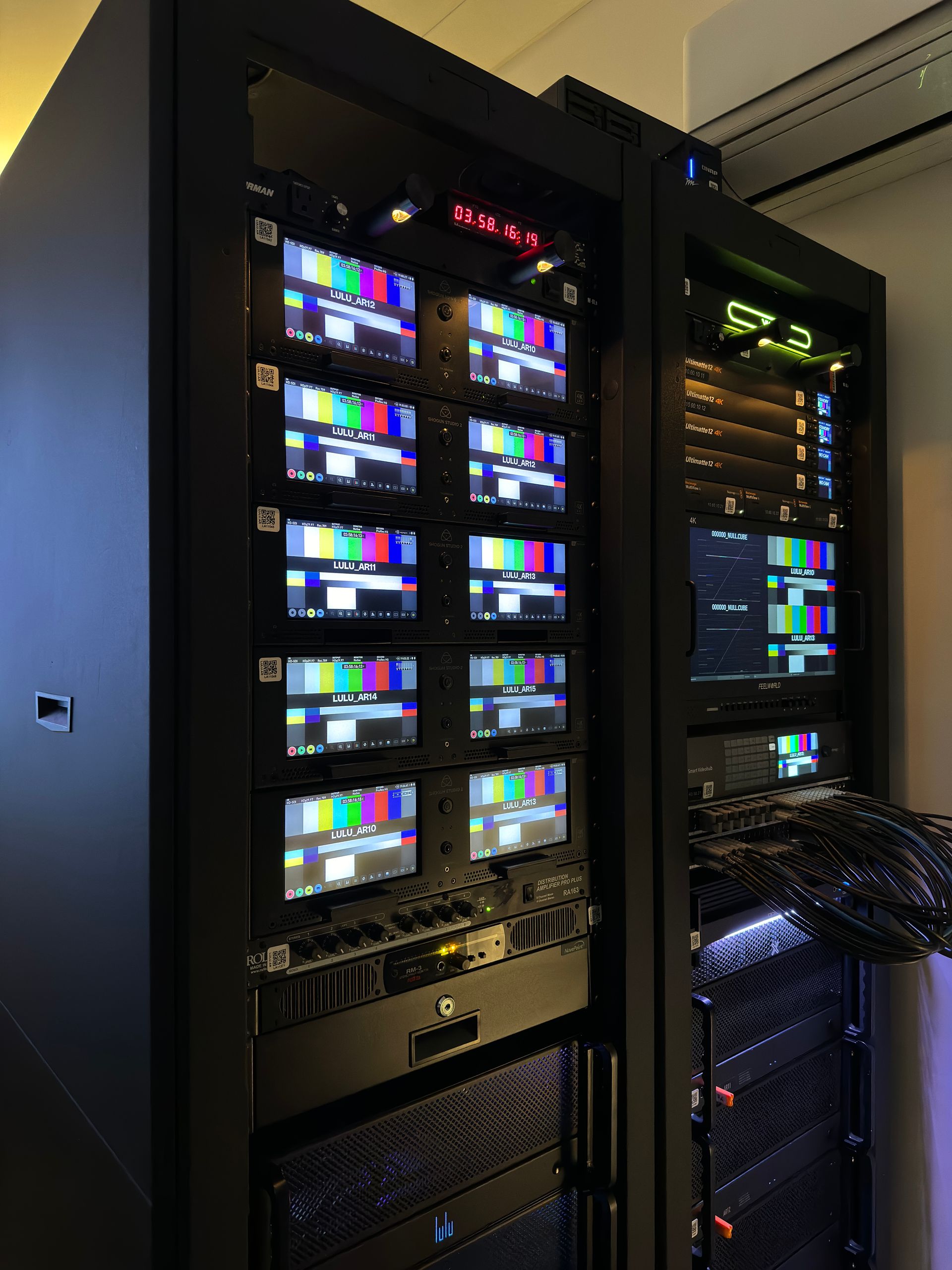 Built on a backbone of 4K 12G video and 10G networking, our studio offers a true turnkey virtual production pipeline: fully routable cameras, 15 Unreal Engine render nodes, 12 mBox media servers, multi-viewers, and record decks—engineered for flawless keying and frame-accurate sync.